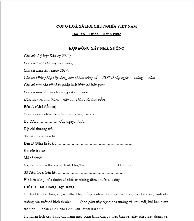 Mẫu hợp đồng xây nhà xưởng 2025