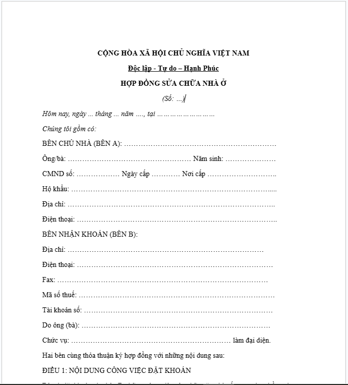 TẢI VỀ MẪU HỢP ĐỒNG SỬA CHỮA NHÀ Ở 2025