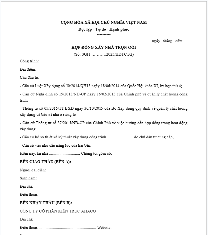 Mẫu hợp đồng xây nhà trọn gói 2025