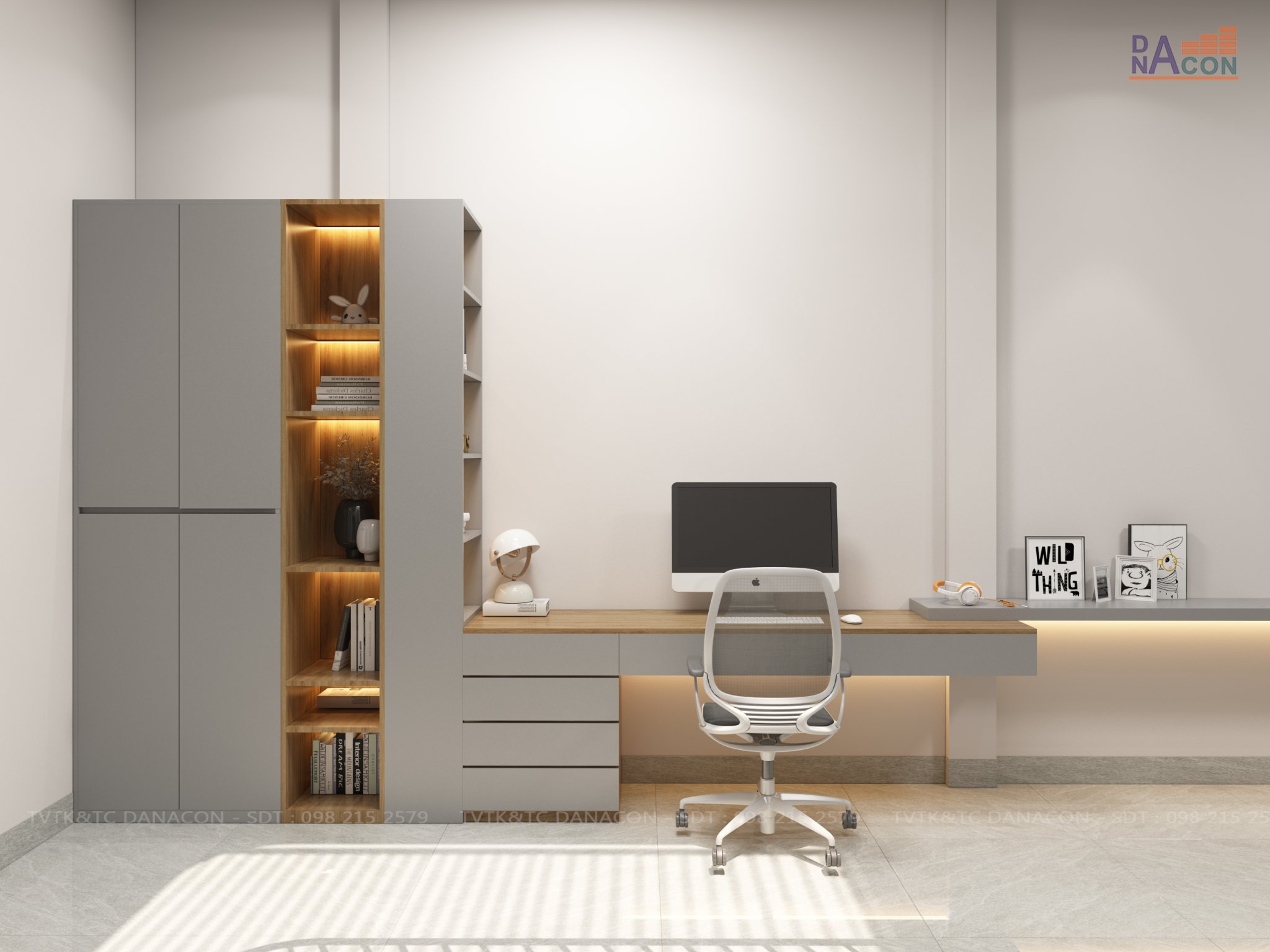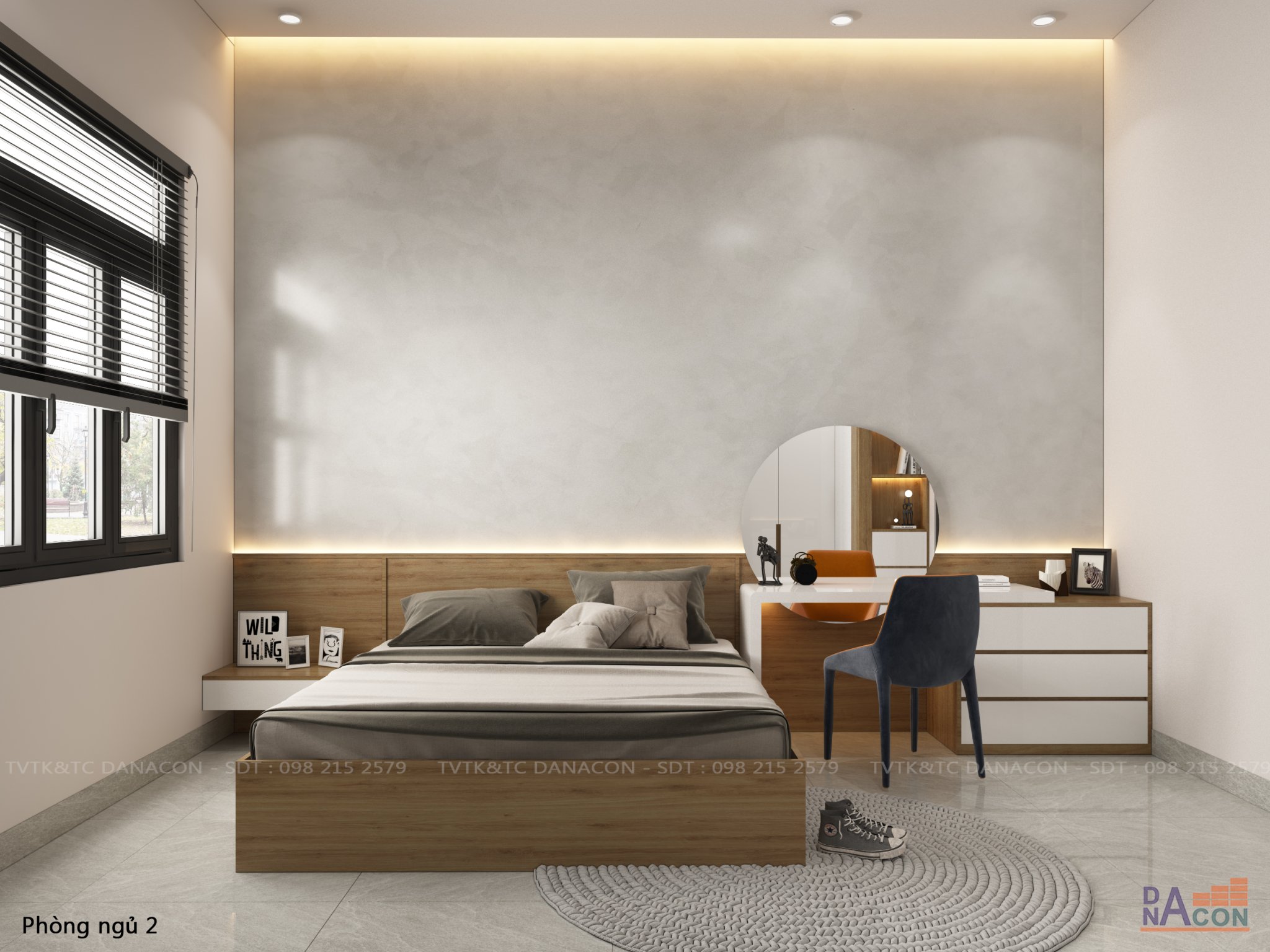 Phòng ngủ hiện đại tập trung vào giường ngủ thoải mái, tủ quần áo âm tường và các phụ kiện trang trí đơn giản. Tông màu nhẹ nhàng giúp tạo nên không gian thư giãn và dễ chịu.